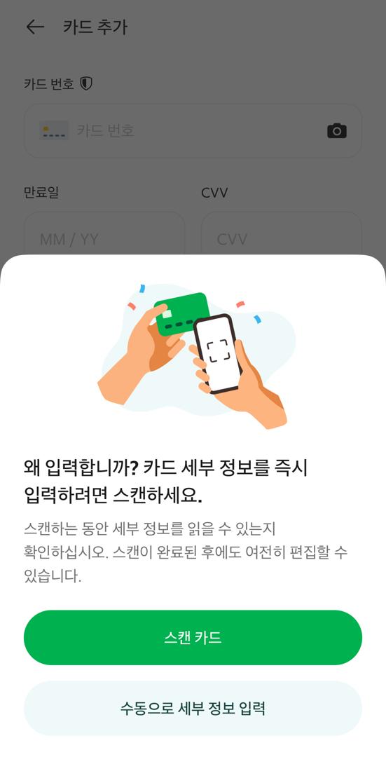 3. "스캔 카드"를 눌러서 카드를 스캔하여 정보를 자동으로 입력하거나 "수동으로 세부 정보 입력"을 눌러서 직접 카드 정보를 입력합니다.