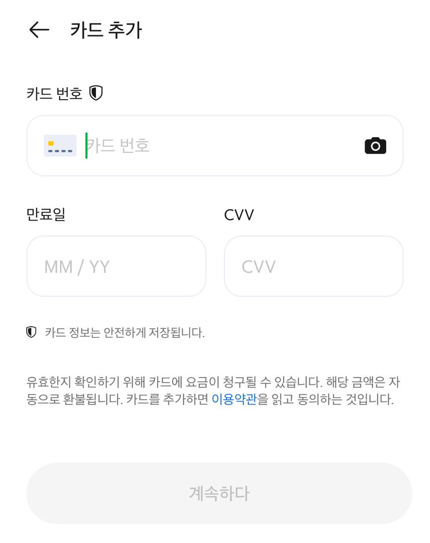 카드 등록이 완료되면, 다음부터는 간편하게 카드로 결제할 수 있습니다. 등록된 카드는 금융 탭에서 관리할 수 있으며, 기본 결제 방법으로 설정하거나 필요에 따라 삭제할 수도 있습니다.