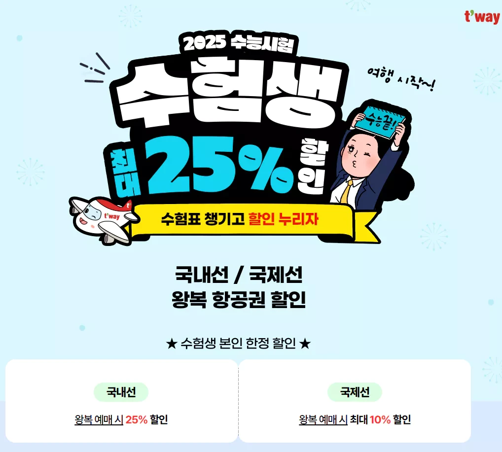 2025학년도 수능을 준비하는 수험생들을 위해 여러 항공사에서 특별 할인 혜택을 마련했습니다. 특히, 티웨이항공에서는 국내선 최대 25% 할인과 국제선 최대 10% 할인을 제공하고 있습니다. 이 외에도 다양한 항공사에서 수험생을 위한 할인 혜택을 제공하고 있으니, 자세히 살펴보도록 하겠습니다.
