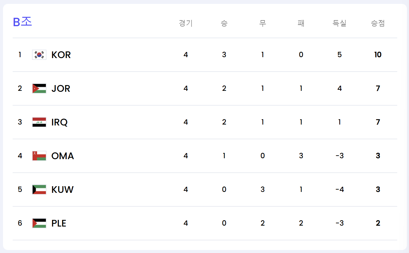 대한민국은 현재 B조에서 4경기를 치러 3승 1무로 승점 10점을 기록하며 조 1위를 유지하고 있습니다. 이번 쿠웨이트전에서 승리할 경우, 본선 진출에 한 걸음 더 다가가게 됩니다.