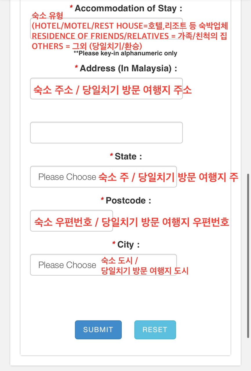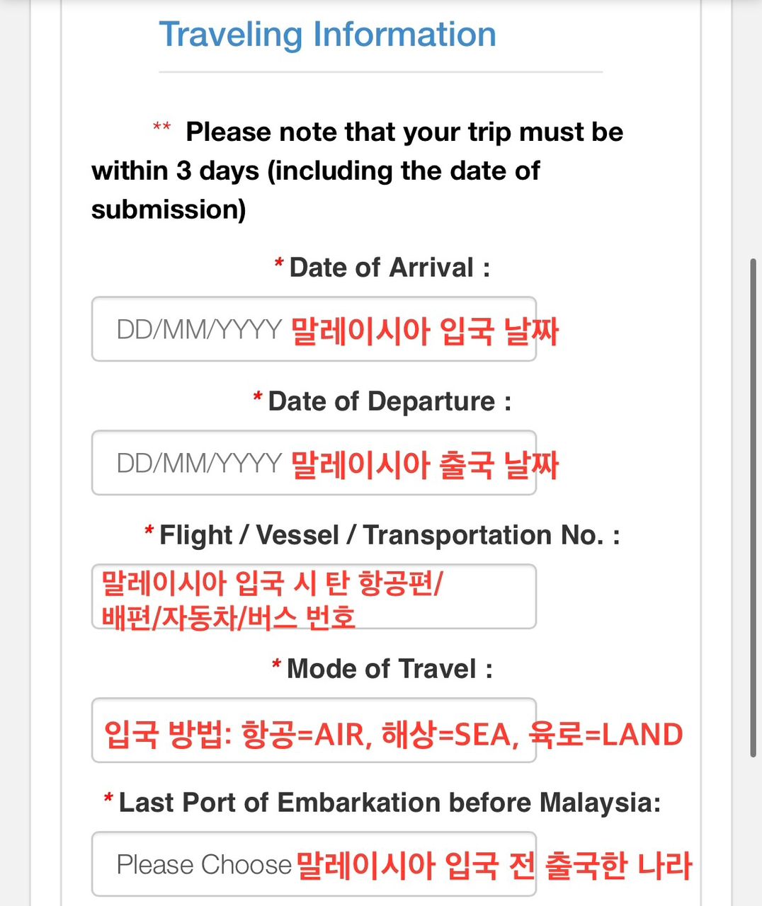 아래 안내를 따라 입국신고서를 작성하시면 됩니다. 간혹 많은 분들이 헷갈려하는 부분이 말레이시아 입국 전 출국한 나라 (Last port of embarkation before Malaysia)인데요, 예를 들어 한국에서 출발해서 말레이시아에 직항으로 들어오는게 아니라 싱가포르나 태국을 거쳐서 오는 경우, Last port of embarkation before Malaysia에 한국이 아닌 싱가포르/태국을 입력하셔야합니다.
